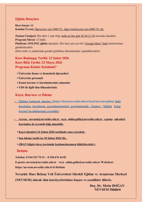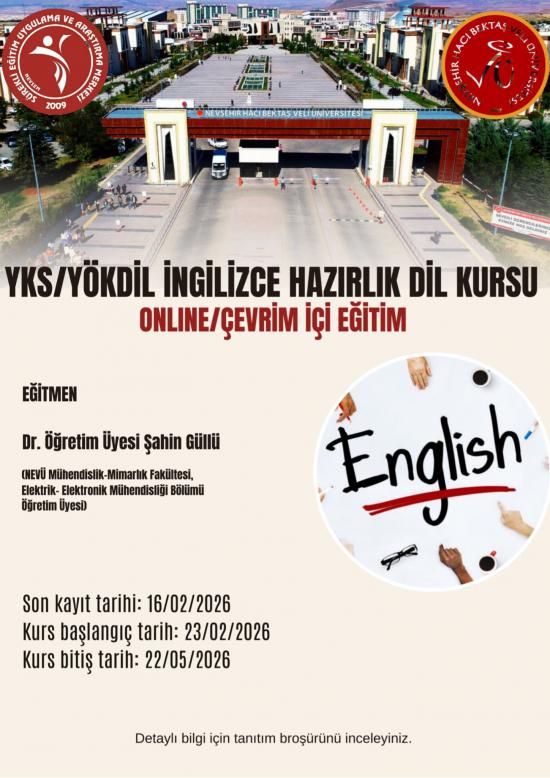 Nevşehir Hacı Bektaş Veli Üniversitesi Sürekli Eğitim Uygulama ve Araştırma Merkezi (NEVSEM) olarak üniversite lisans ve yüksek lisans öğrencileri, akademik ve idari personeli, ilimiz kamu kurum ve kuruluşlarında çalışanlar ve her kesimden dış paydaşlarımız için hazırlanmış olan Programımız, "İngilizce YDS/YÖKDİL Hazırlık Kursu" başlığıyla ONLINE/ÇEVRİM İÇİ olarak gerçekleştirilecektir.